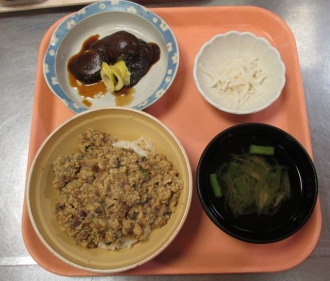 今日は、かき揚げ丼の日でした。きゅうりの酢の物が、箸休めにちょうど良い感じでした。野菜嫌いと伺っていたご利用者のAさんは、目の前で「おいしい!おいしい!」とパクパク召し上がられ、職員一同びっくり!!(驚)食わず嫌い王だったのか、本当に美味しかったのか?!いすれにせよ、新たな発見にほっこりさせてもらえました。