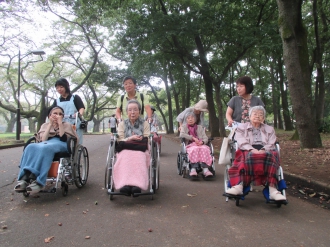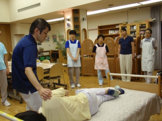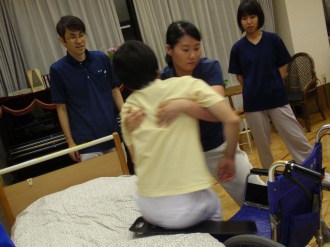 新人職員には、毎年車いすに乗ったままで研修をうけてもらっています。車椅子での動作を実体験してもらうためです。ご利用者様をそれぞれの体験を通して理解を深めています。