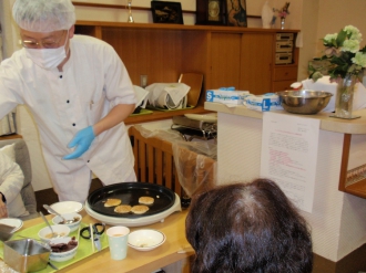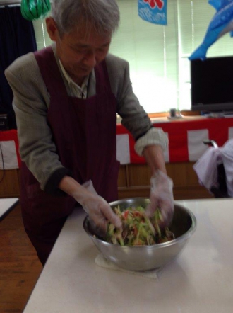 男性ご利用者のSさんに協力いただいて、材料をまぜて、味をなじませます。みんな「おいしそーだねぇ」って声をかけてくれて、笑顔がこぼれます。