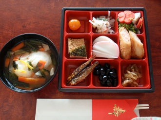 写真は年明けのお祝い膳です。メニューは、お雑煮風、甘酒と屠蘇魚、のし鶏、五色なます、紅白かまぼこ、きんかんの甘煮、煮しめです。栄養部が心をこめて作ったお祝い膳。