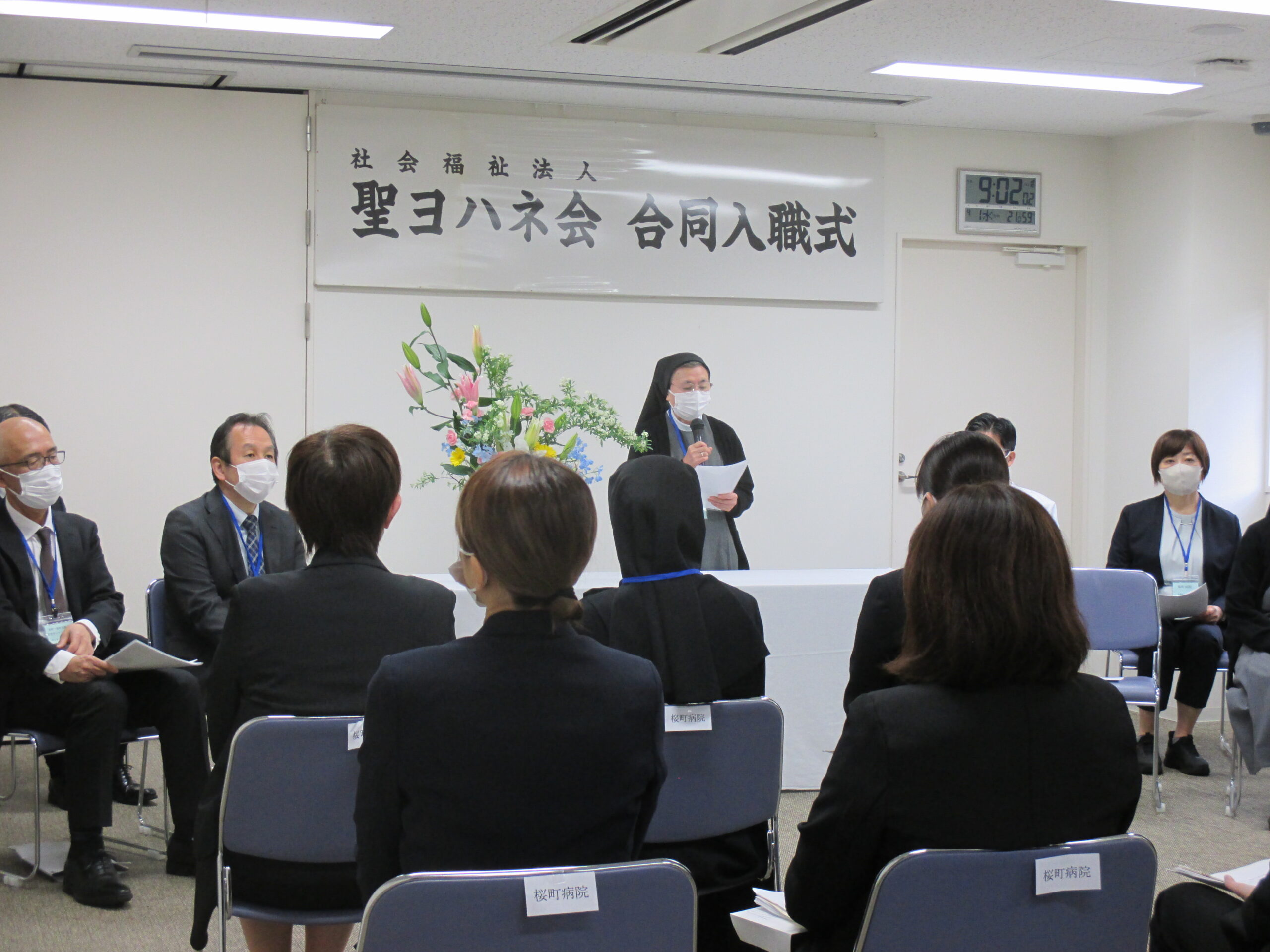 今年度も合同入職式を開催することができました。あいにくの雨ではありましたが、満開の桜が新入職員を迎える中、多くの新入職員が法人本部に集まりました。